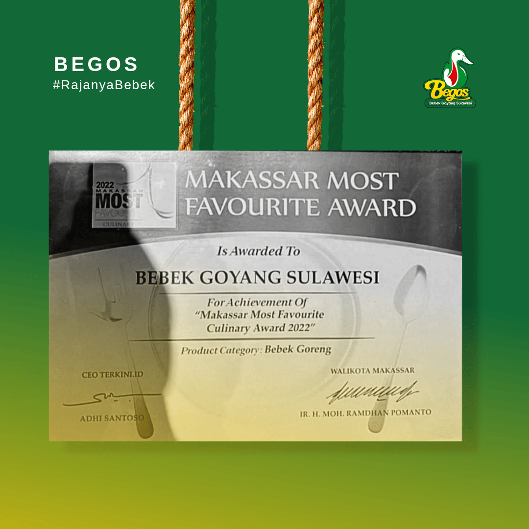 Belum lama ini Bebek Goyang Sulawesi atau BEGOS telah menjadi salah satu usaha kuliner yang tergabung dalam survei kuliner terfavorit di Makassar dalam Most Favourite Culinary (MFC) Award Makassar yang diadakan oleh Terkini.id dalam kurun waktu 10 tahun terakhir.